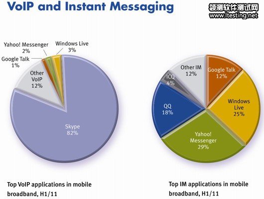 VoIP和IM是增速最快的应用,增速达101%,不过仅占全球移动数据宽带4%份额。在IM应用中,QQ占比达18%,Yahoo Messenger占比达29%,Windows Live占比达25%,Google Talk占12%,ICQ占4%。Skype在全球移动VoIP市场排名第一,不过份额正被Viber、WhatsApp、ooVoo等蚕食。