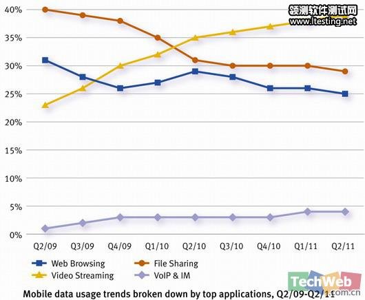 不同服务流量占比趋势(09年Q2至11年Q2)