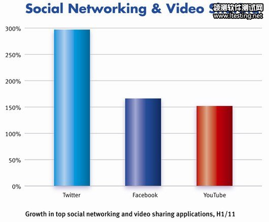 Facebook和Twitter在社交网络应用中仍排前列,分别增长166%和297%。与此同时,文件分享应用占全球移动宽带29%市场份额。Facebook有2.5亿移动用户,这些用户的活跃度是非移动用户的2倍。Facebook移动流量年复合增长率达607%。Twitter上半年增速达297%,年复合增长率达1400%。Twitter用户每天发布超过2亿条微博。