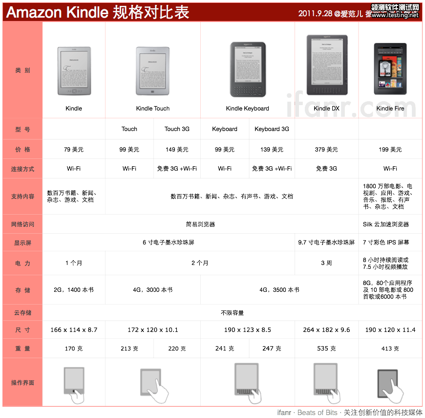 最后附上所有 Kindle 设备规格对比表(图片点击放大):