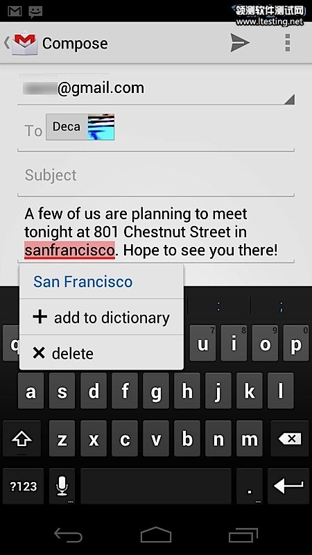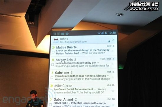 收件箱字体得到更换,图标、布局均重新设计,底部快捷栏可以写邮件、搜索、访问标签,加入离线搜索支持,收件箱显示两行文字预览,左右滑动切换Gmail会话。