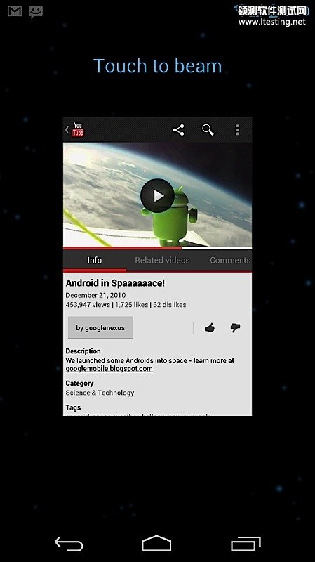 基于NFC的Android Beam功能可以让两部手机交换网站、联系人、导航、YouTube视频等,甚至官方电子市场的下载链接。