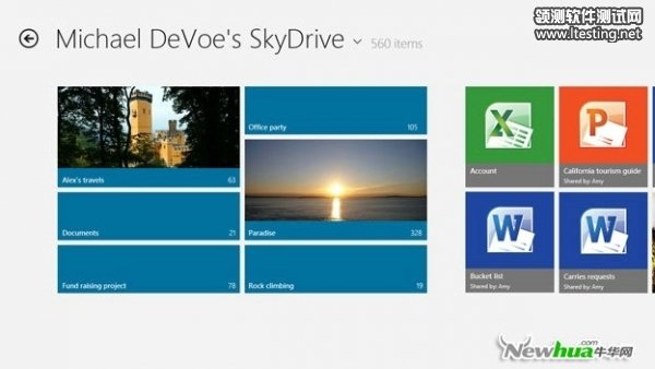 微软的SkyDrive云存储服务与Windows 8紧密集成,它支持用Windows Live账户登录。现在,用户可以直接从照片应用中访问储存在云上的照片。