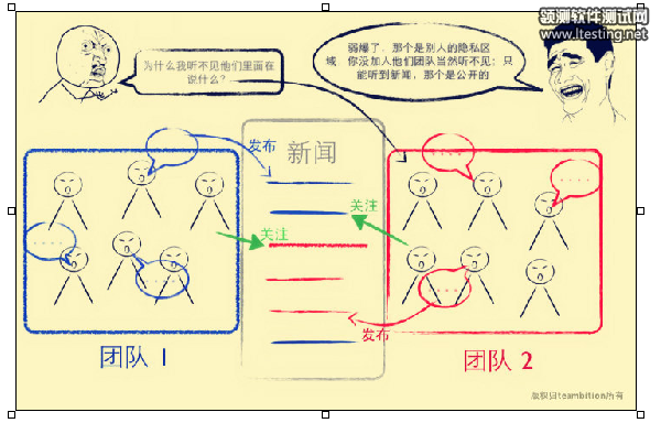 上面这张图来描述这种环境:团队1和团队2内部讨论的话题不会被外面看到,但是他们可以发布自己的信息成为新闻,新闻中心是公开的,网络中所有人都可以关注自己感兴趣的团队、组织。