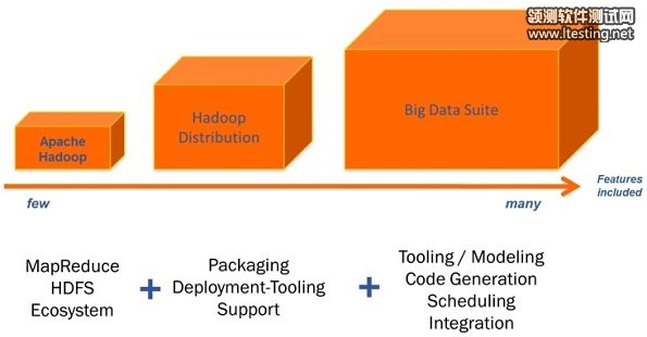 下图展示了Hadoop平台的多种选择。你可以只安装Apache 发布版本,或从不同提供商所提供的几个发行版本中选择一个,或决定使用某个大数据套件。每个发行版本都包含有Apache Hadoop,而几乎每个大数据套件都包含或使用了一个发行版本,理解这一点是很重要的。