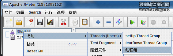 一个性能测试请求负载是基于一个线程组完成的。一个测试计划必须有一个线程组。测试计划添加线程组非常简单。在测试计划右键弹出下拉菜单(添加-->Threads(Users)--->线程组)中选择线程组即可。