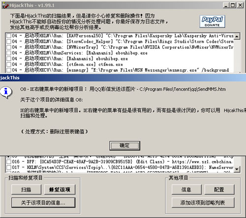 HijackThis的扫描结果中看到(图2),QQ、易趣购物这些程序不是恶意程序,但绑定到IE上了,对很多用户来说这些程序是无用的,可以删除它们恢复IE浏览器的自由。