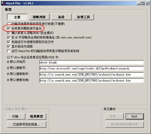 小提示:HijackThis具有备份功能,如果操作中误删除了应用程序还可恢复还原。