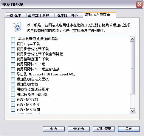 下载链接上、图片上等)右击鼠标后弹出的快捷菜单中的项目。接下来如何清理它们,想必大家看了后都会操作:选择列表中欲删除的所有项目,最后单击“立即清理”按钮即可。