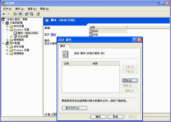 2.打开“运行”输入 “gpedit.msc”,打开“组策略”面板。在“本地计算机策略→计算机配置→Windows设置→脚本(启动/关闭)”中双击右边窗口中的“启动”,打开“启动属性”窗口。