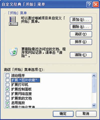 左侧的对话框被切分为两部分,上部是固定的常用程序列表,用户可以利用它在浏览器中创建快捷方式,也可以通过拖放功能将下部的快捷方式添加到列表中,这种功能具有很强的易用性。在XP系统中,这种操作变得更为简单,右键点击任意一个快捷方式,选择“附到开始菜单”便可将该程序添加到开始菜单了;同理,右键点击快捷方式,选择“从开始菜单脱离”可以撤销上述操作。
