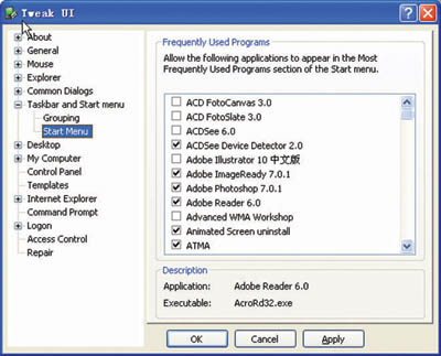 在向开始菜单添加快捷方式的时候,XP又表现出了它智能化的一面。例如,用户不能重复添加已经存在的快捷方式,或添加从快速启动栏中启动的项目;用户可以用右键菜单将开始菜单中的快捷方式清除,但这并不能阻止它们又重新回来。正是这个不尽如人意的地方让TweakUI可以大显身手,打开“Taskbar and Start menu”下的“Start Menu”对话框,会出现所有程序的列表,只需要反向选择程序便可以永久禁止其快捷方式被收入开始菜单(见图3)。