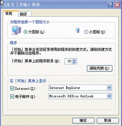 对话框下部为常用程序的快捷方式列表,用户可自行设定快捷方式的数量上限,超过上限的新图标会自动替换旧图标,但是通常数量上限为30个。在设定上限的对话框(“开始菜单属性” “自定义” “常规”)中,你可以选择是否将浏览器和电子邮件图标放在固定常用程序列表中,以及是否清空最近使用程序列表(见图2)。
