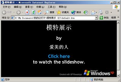 好了,我们现在来点击“现在就查看”按钮,这样就会打开个IE窗口,显示幻灯片的一些标题、制作者等信息(如图4)。点击“Chick here”即开始播放(如图5),在左上方是三种播放模式,如果想自动按顺序播放,那么则选择“Slide Show”,这样在右上角就会有一个播放按钮,点击即自动进行切换;如果选择“Filmstrip”方式的话,那么所有的图片都会以缩图片的形式显示在屏幕最下方,要显示哪一张图片单击即可。