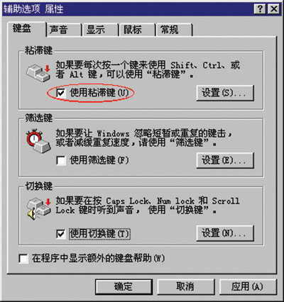 2.单击“键盘”选项卡,选中“使用粘滞键”复选框(如图)。