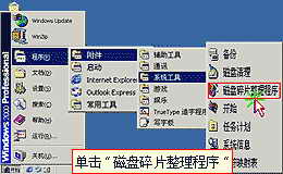 打开“开始”菜单,移动鼠标到“程序”、“附件”、“系统工具”,单击“磁盘碎片整理程序”。(见图二)