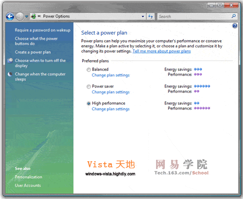 在Windows Vista中,有三种预设的节省模式,分别为平衡 (Balanced)、节能优化 (Power Saver)与性能优先 (High Performance),在控制面板中的电源选项中可以自主选择,对台式机用户而言,如果节能不是您所关注的,那么可以直接选择性能优先 (High Performance)模式,这样,您的系统就不会在1小时后便进入睡眠状态;而对笔记本用户而言,可能选择节能优化 (Power Saver)模式更为明智。