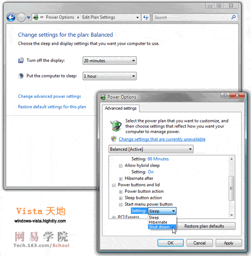 在默认安装中,Windows Vista使用其称为平衡方案(Balanced plan)的节能模式,在许多人的测试中,对该方案中预设的在系统闲置1小时后进入睡眠状态的设定颇有微辞:有人指责1小时的时间过长而另一些人则认为一小时的时间又太短了,——众口难调,微软也很可怜的 ——此外,更多的人则对微软将>开始菜单中的关机按钮缺省设置为睡眠而真正的关机则隐藏在菜单深处而不满。那么,有没有办法调整这些设置呢?