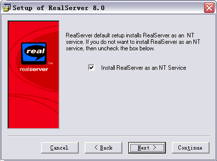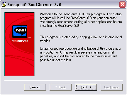 最后就是安装RealServer软件了。双击安装图标,弹出如下对话框:大致的意思就是欢迎你进入Realserver8.0的安装界面。点Next>