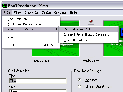 双击桌面上的Realproducer图标,弹出Realproducer的主窗口后,选择Files-Recording wizards-Record From Files。