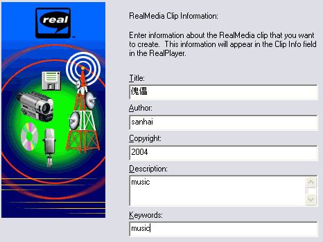 点击后会弹出一个流媒体文件制作的向导,首先让用户选择要制作流媒体文件的源文件,单击下一步,弹出的对话框分别是输入标题,作者,版权,描述,关键字,填写完毕后进入下一对话框就是我们前边提到的制作多流和单流的流媒体文件了。