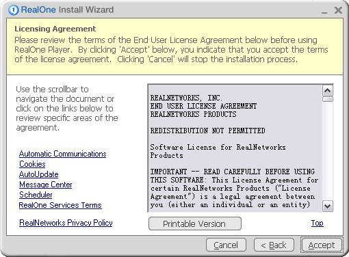 弹出的第二个对话框是关于RealOne安装过程中的一些协议,都是英文的,我们大可不闭理会,因为这写协议相对于我们来说没有什么意义,点击Aclearcase/" target="_blank" >ccept就行了。如果你对前面的对话框里的内容填写的感到不是很满意在这里可以点击Back回到上一个对话框中。