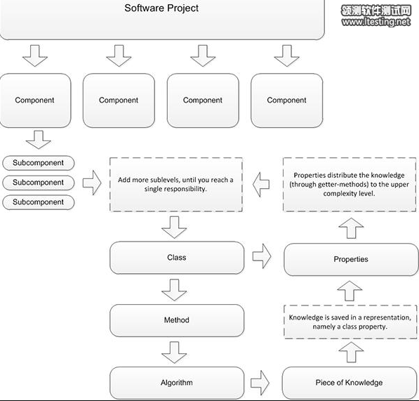 组件还可以往下再分,这样复杂性将被降低到单一职责(single responsibility),每个职责可以使用一个类来实现,类包含了方法和属性。方法实现算法,这些算法和算法的子部分是构成软件业务逻辑的最小知识块。你只需要保证这些块不重复即可。