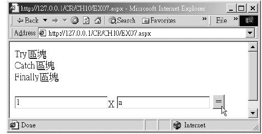 Finally 区块不管有没有发生例外都会执行,我们可以使用Finally 区块来做一些最后的处理。下列范例当我们按下Button1 程序执行到Try 区块,无论例外有无发生都会执行Finally 区块的中的程序代码: