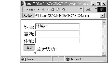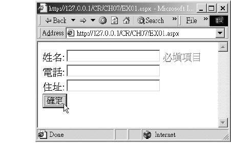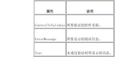 ControlToValidate 属性用来指明要检验的控件,而ErrorMessage 属性用来提供给其它控件显示相关讯息,Text 属性在使用者的输入没有通过验证时立即显示。下列程序代码限制姓名字段一定要输入,否则无法触发按钮的事件程序: