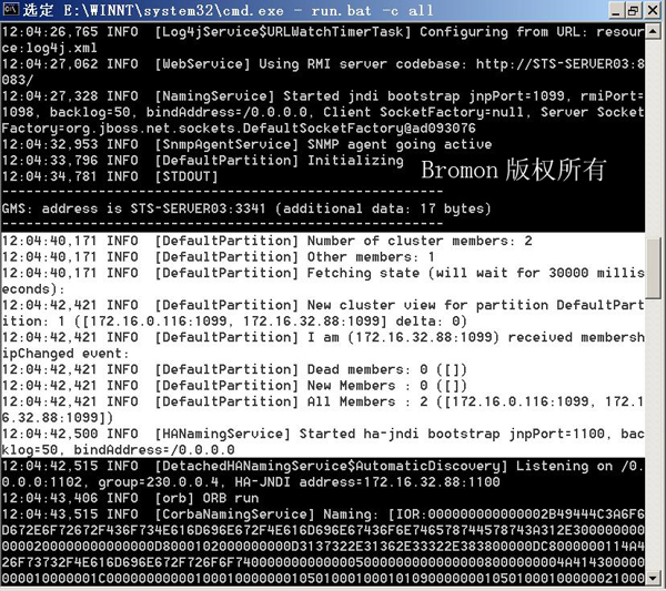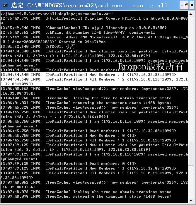 负载均衡的配置基本完成,启动jboss,其中过程中会列出DefaultPatition中所有的节点: