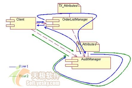 图1显示了两个相互独立的调用关系流。在流1中,如果客户端拥有TX关系,OrderListManager要么参与它,要么启动一个新的TX,这依赖于Client是否在某个TX中,以及为OrderListManager方法提供了什么样的TX属性。OrderListManager服务接下来调用AuditManager方法的时候,这样的解释也是正确的。