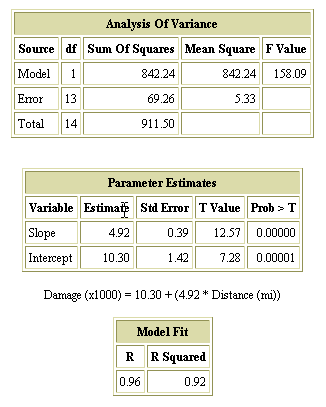 在火灾损失研究中,随机获得大小为 12.57 的 T值的概率小于 0.00000。这意味着对于与该研究中观测到的