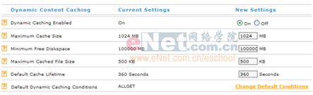 图1.1列出的是动态内容缓存的配置选项。这里需要注意的是Maximum Cache Size这个配置选项,默认的设置是”unlimited”,这里建议是改为一个固定值,如上图设定的是1G。同时对“Minimum Free Diskspace”的设置是表示当磁盘空闲空间少于设定值时,不再进行cache操作,这个设置需要根据磁盘的具体应用而定。