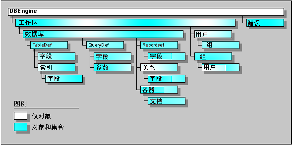 在 DAO 的本机格式中,包含 21 个对象和 20 个集合。而且,DAO 不仅提供单个的对象,如表和字段,还提供对象所属的集合。对象的这种清晰的层次结构使得能够轻松地将面向对象的原理应用于数据库开发。