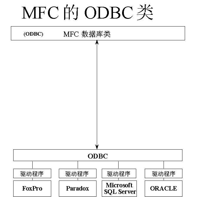 这里是基于 ODBC 的数据库类的图片,与您所了解的相同。顶端的栏代表基于 ODBC、与 ODBC 交谈的 MFC 类。每个数据库的 ODBC 驱动程序都解释 SQL 调用,并针对每个数据源对其进行转换。许多数据源都与相应的驱动程序一起显示在关系图的底部,以提醒您 ODBC 的灵活性。