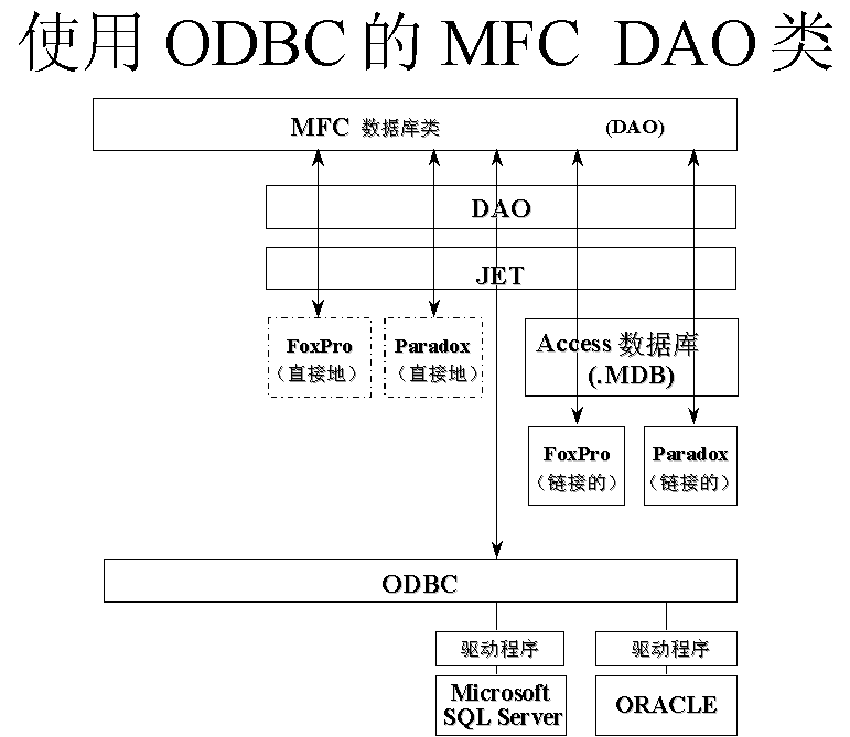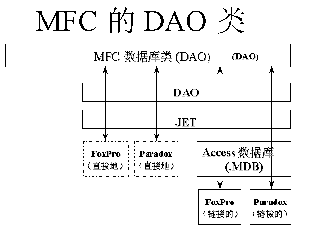 在多数情况下,MFC 4.0 中的 DAO 数据库类允许您直接访问桌面数据源而无须使用 ODBC。DAO 数据库类所具有的同时打开多个数据库类型的能力、使用多数据源的能力以及数据定义语言能力,使其成为重要的开发选择方案。