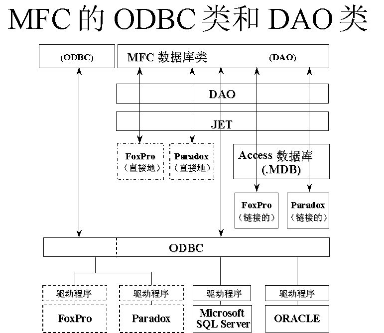 如果使用 DAO 数据库类,就可以经由 ODBC 访问服务器类型的数据库(如 Microsoft SQL Server 和 ORACLE)。图 3 不是完整的图片,因为它并没有包括对所有类型数据源的访问。