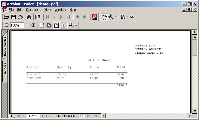 INSERT psopdf(code) SELECT SPACE(60) + 'COMPANY LTD' INSERT psopdf(code) SELECT SPACE(60) + 'COMPANY ADDRESS' INSERT psopdf(code) SELECT SPACE(60) + 'STREET NAME & No' INSERT psopdf(code) SELECT ' ' INSERT psopdf(code) SELECT SPACE(34) + 'BILL OF SALE' INSERT psopdf(code) SELECT ' ' INSERT psopdf(code) SELECT 'Product' + SPACE(10) + 'Quantity' + SPACE(10) + 'Price' + SPACE(10) + 'Total' INSERT psopdf(code) SELECT REPLACE(SPACE(56), ' ', '_') INSERT psopdf(code) SELECT 'Product1' + SPACE(9) + '10.00 ' + SPACE(10) + '52.30' + SPACE(10) + '5230.0' INSERT psopdf(code) SELECT 'Product2' + SPACE(9) + '2.00 ' + SPACE(10) + '10.00' + SPACE(10) + ' 20.0' INSERT psopdf(code) SELECT REPLACE(SPACE(56), ' ', '_') INSERT psopdf(code) SELECT SPACE(50) + '5250.0'
