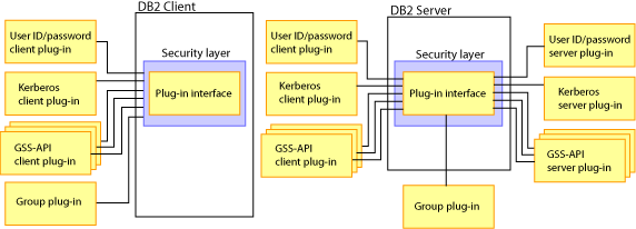 在 DB2 Version 8.2 中,默认行为是使用在操作系统级别实现身份验证机制的用户 ID/口令插件。下图提供了 DB2 UDB 安全插件基础设施的高级视图: