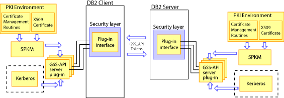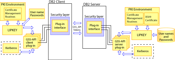 下图描绘的高级视图是,当使用支持 SPKM 或 LIPKEY 的 GSS-API 插件时,DB2 UDB 身份验证的工作原理。