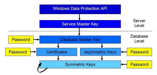 图中引出箭头的密钥或服务用于保护箭头所指的密钥。所以服务主密钥(service master key)保护数据库主密钥(database master keys),而数据库主密钥又保护证书(certificates)和非对称密钥(asymmetric keys)。而最底层的对称性密钥(symmetric keys)被证书、非对称密钥或其他的对称性密钥保护(箭头又指回它本身)。用户只需通过提供密码来保护这一系列的密钥。
