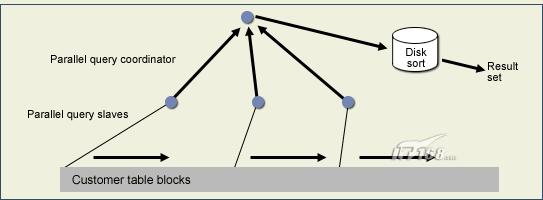 一旦表被划分成块,Oracle启用并行的子查询(有时称为杂务进程),每个子查询同时读取一个大型表中的一块。所有子查询完毕以后,Oracle将结果会传给并行查询调度器,它会重新安排数据,如果需要则进行排序,并且将结果传递给最终用户。OPQ具有无限的伸缩性,因此,以前需要花费几分钟的全表检索现在的响应时间却不到1秒。