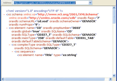 当我注册一个模式时,我可以控制Oracle9i数据库生成的对象和类型名;我也可以控制被用来存储我的XML数据的特定数据类型。可以通过使用XML DB知识库定义的属性和oraxdb名字空间的部分注释XML模式来进行这些控制。当我不提供那些属性时,Oracle9i数据库为我生成它们,我可以通过查看存储在该知识库中的模式版本来简单地浏览Oracle9i数据库所生成的内容。图1说明了你如何能够方便地访问知识库数据,这次是通过HTTP,使用一个标准的Web浏览器来访问的。图1显示了我的知识库中的CD模式的一部分,你可以看到模式注释,它们全都以"oraxdb"开始。注意,URL使用8080端口,它是知识库使用的默认HTTP端口。