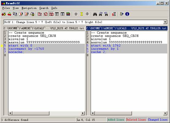 4. 显示具体的不同信息(功能非常强大,这是PL/SQL DEVELOPER借助第三方工具扩展的功能,当前版本用的工具是ExamDiff1.6版)
