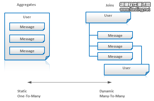 聚合 Aggregates 并不适用于数据字段经常被改变的情况。对此,我们需要把那些经常被改变的字段分到另外的表中,而在查询时我们需要联结数据。例如,我们有个Message系统可以有一个User实体,其包括了一个内嵌的Message实体。但是,如果用户不断在附加 message,那么,最好把message拆分到另一个独立的实体,但在查询时联结这User和Message这两个实体。如下图: