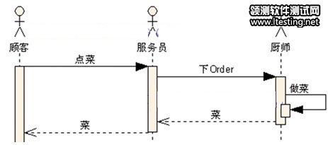 你去餐厅吃饭,向服务员点餐到服务员送菜上来,这个过程用顺序图可表示如下: