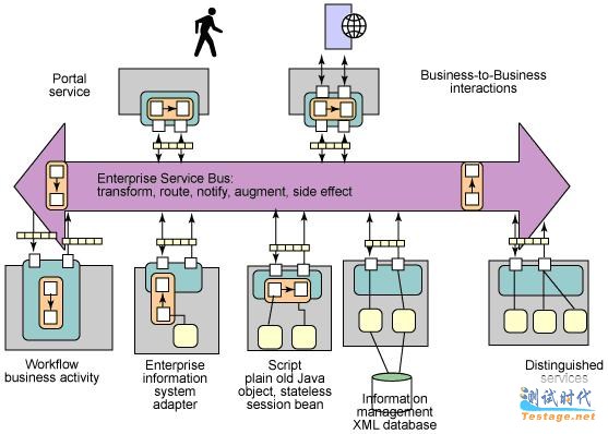 核心是服务间的 ESB 提供的连通性。ESB 是多协议的,支持点到点和发布-订阅两种通信类型,并支持快速处理消息的中介服务。IBM WebSphere MQ,IBM WebSphere MQ Integrator Broker 以及支持 Web 服务和 Java 消息服务(JMS)的 WebSphere 都属于第一个类别。