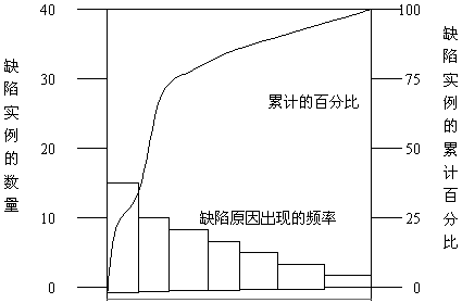3.排列图。排列图是一种直方图,由事件发生的频率组织而成,用以显示多少成果是产生于已确定的各种类型的原因的(见图2)。等级序列是用来指导纠错行动的--项目小组应首先采取措施去解决导致最多缺陷的问题。排列图与帕累特法则的观点有联系,后者认为相应的少数原因会导致大量的问题或缺陷。
