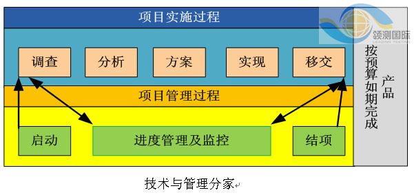 其实当一个项目在实施过程中发生问题的时候,技术和管理的工作应该同时进行,技术人员应该考虑如何解决有关技术的问题,考虑不同的处理方法和技术应用方法;管理人员必须考虑这个问题对项目所带来的影响及冲击,考虑适当的措施降低项目延误和成本增加的风险,考虑资源的调配和建立最好和最坏的应变策略。在明确的分工下,技术的实施过程才能够有效地控制在项目管理的体系中。