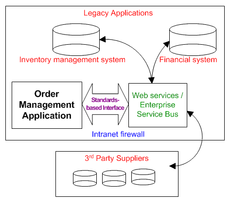 在软件开发中我们面对的一个主要问题是复杂度。我们知道降低复杂度对生产力有很大影响。5在更高的抽象层次工作降低了复杂度并使交流变得容易。 一种有效降低复杂度的方法是复用已有资产,比如可复用的组件,继承系统,已有业务过程,模式,或者公开源码软件。两个关于复用的很好的例子在上一个十年对软件工业产生了巨大影响,它们是对中间件的复用,比如数据库,Web服务器和入口,以及后来的对公开源码软件的复用,它们提供了或大或小的可利用的组件。今后,Web服务可能会对复用产生主要影响,因为它们提供了在完全不同的平台上,以及客户和服务的提供者之间只有松散耦合的情况下复用主要的大块功能的简单方式,如图6所示。这意味着你可以更容易地采用不同的服务组合来实现业务需要。公开标准,比如RAS,UDDI,SOAP,WSDL,XML和UML,也方便了复用。